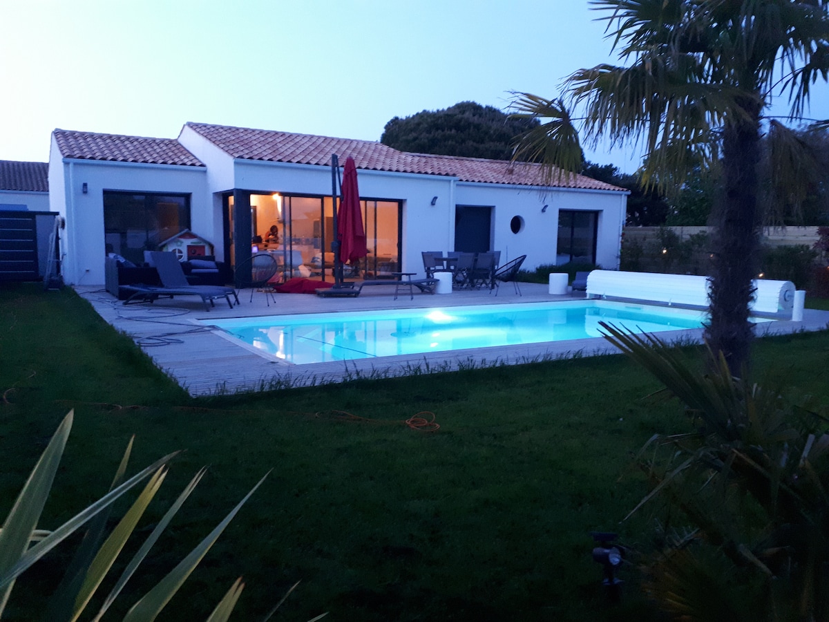The land of 1300 m2 is located in the 1st row on the wild coast of St-Denis-d'Oléron, 50 meters from the ocean. Through a private gate you access the ocean by crossing the exceptional area of the vegetated dune with a view of the lighthouse and sunsets. You have private access to an 8-meter infinity pool that is efficiently heated with a solar cover, a pétanque court, large terraces/solarium with BBQ (over 140 m2), a playground with table tennis and darts, bicycles are available for free.