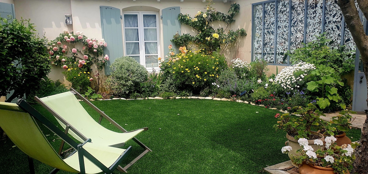 Dans le joli village de la couarde au centre de l'île de Ré, le long de l' impasse des vignes aux folies, maison de 2 chambres,(draps et Linge de toilette fournis), meublée dans le style de l'île de Ré avec un agréable séjour et une cuisine américaine entièrement équipée.Jardin très fleuri, avec transats, et terrasse pour prendre vos repas à l'ombre des oliviers. Au coeur des pistes cyclables, à 300m de la plage, des commerces et de l'arrêt du Ré bus. Repos dans ce quartier très calme.