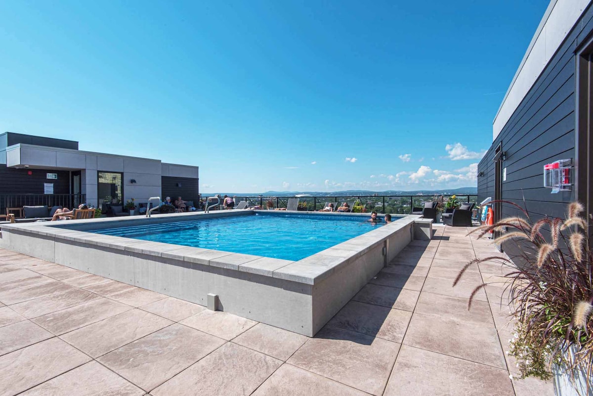 The 1106 is the novelty of the St-Roch district which is in full effervescence. In addition to the indoor gym, a heated swimming pool** is located on the roof surrounded by a magnificent terrace with a view of Old Quebec. The 1106 is a comfortable condo with King bed and Queen sofa bed in a fresh and cared decor. Everything is there for a perfect stay: air conditioning, washer/dryer, dishwasher, sheets and towels are also at your disposal. The ideal location for visiting Quebec!
