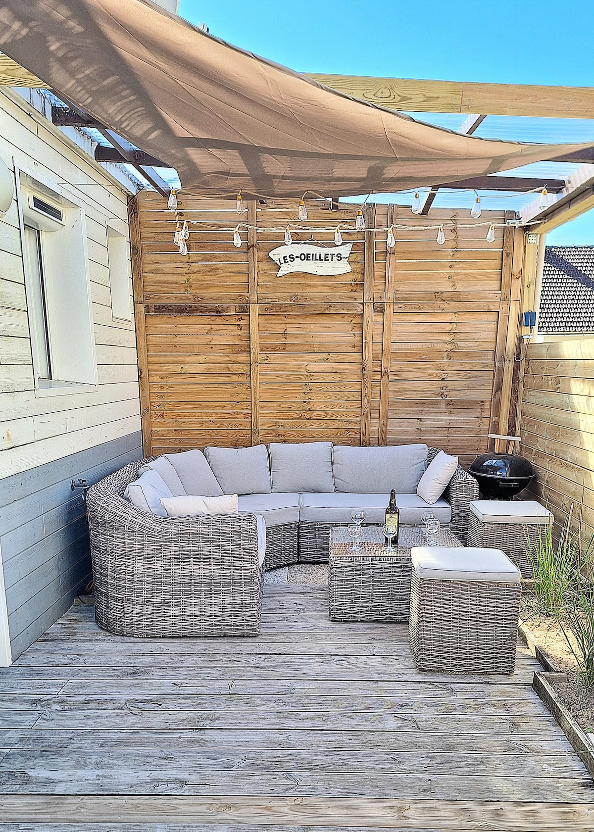 Charmante maison mitoyenne récemment rénovée dans résidence calme, à 400m de la mer et 1,6 km du port. Au rdc : un canapé convertible 2 pers, cuisine équipée, lave linge, lave vaisselle, salle d'eau, terrasse, tables de jardin, jardin, cour sur l'avant. A l'étage : 1 chambre lit 2 pers de 160, en mezzanine lit 2 pers de 140 . Draps non fournis ( possibilité d'en louer sur le port) Lit bébé 60x85, chaise repas, tapis à langer Demandez moi une offre - 25% pour 7 nuits ou + (hors juillet août)