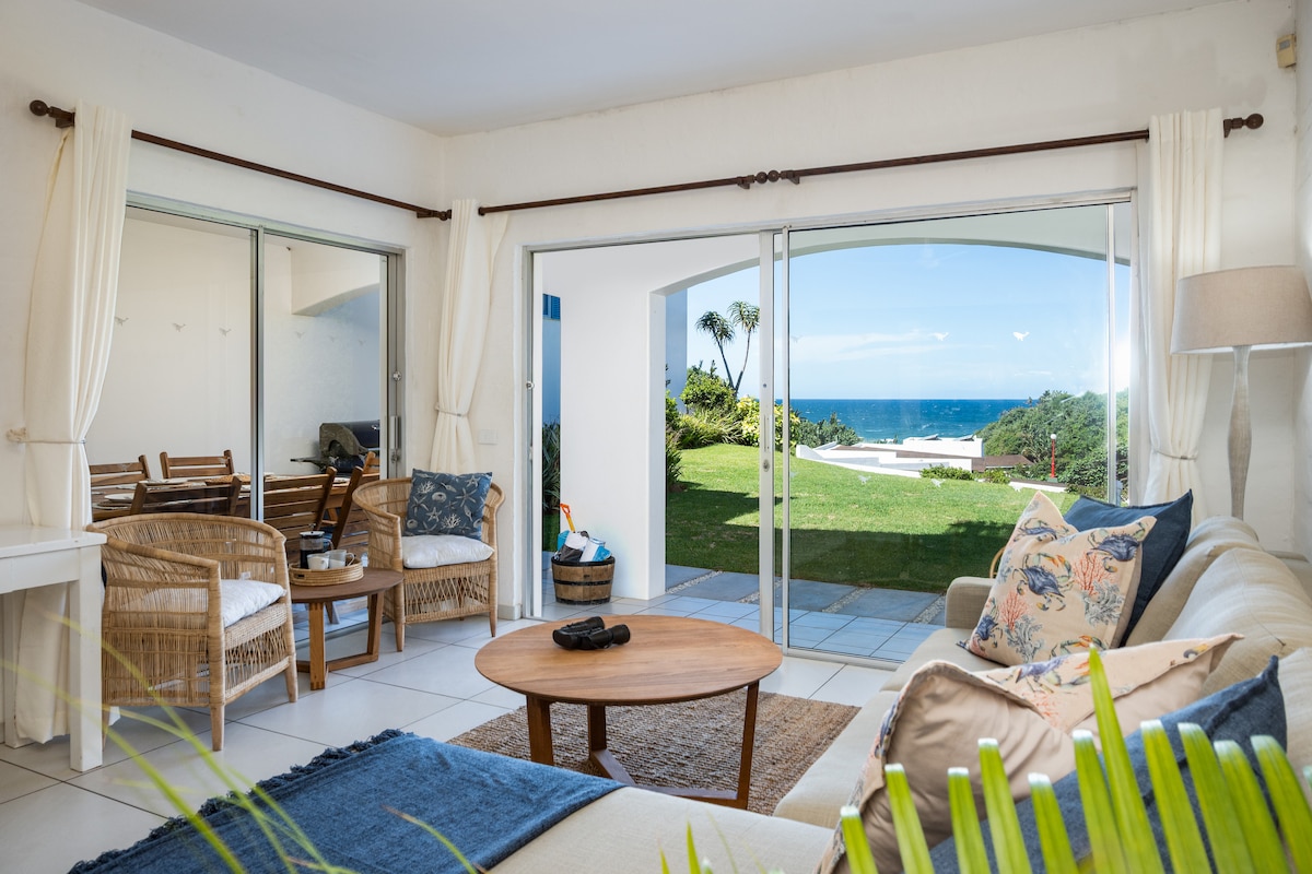 Please note SERVICE DOGs WITH A CERTIFICATE ONLY ALLOWED. Watch the dolphins swim by in a peaceful area of South Africa. Secure complex, parking, swimming pool with braai & picnic area. Beautiful gardens. Laundromat within the complex. Enjoy a sundowner/braai with amazing sea views from 2 “roofed” balconies. You can sit outside in all weather conditions, off the kitchen, lounge & main bedroom. Beaches 1 min walk through a private a gate. Restaurants, shops, golf & more. Managed by B’s Ballito