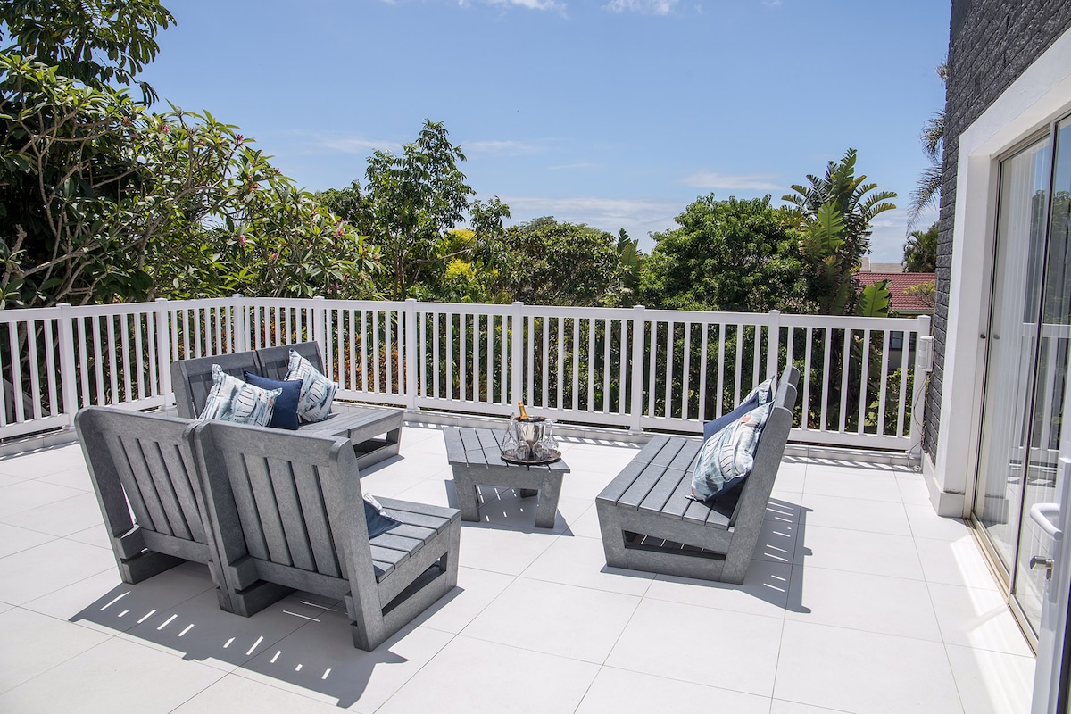 Enjoy this stylish 2 bedroom retreat, a short distance from Ballito's restaurants, bars and swimming beaches. Nestled in a tranquil neighbourhood, relax on the deck, savour the sound of waves, and spot humpback whales (when in season). Equipped with private pool and garden, gorgeous outdoor dining and braai area with beautiful sea view. More than a holiday rental, this is a meticulously curated home, with everything you need for a wonderful stay.