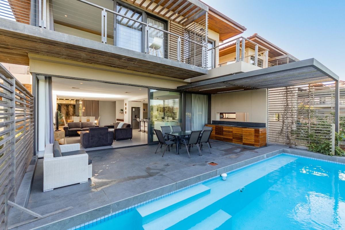 This luxury self catering villa is perfect for creating memories with those you love. With Salt Rock Beach below you, and two entertainment decks, one outside, with Braai options of either charcoal or gas, and one large under cover area with a private warmed pool, families and friends have the perfect place to unwind and be together. 10 Sleeper home - full amenities Undercover warmed private pool, 5 bedrooms,5 bathrooms Secure parking, remote access, Full air-con Smart Hub TV Solar Power