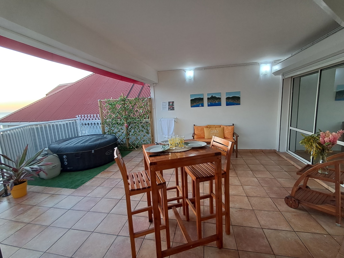Charmant bungalow décoré avec goût situé entre mer et montagne, offrant une vue exceptionnelle sur les Saintes et Marie-Galante depuis une magnifique terrasse en bois avec jacuzzi. Vous pourrez apprécier la mer à perte de vue et profitez du confort de chacune des chambres ouvertes vers l'extérieur. Une localisation parfaite pour accéder aux chutes du carbet 10min, à la gare maritime pour les Saintes 7min, aux plages de sable noir 3min, à la Soufrière 25min.. Idéal pour les familles, amis...
