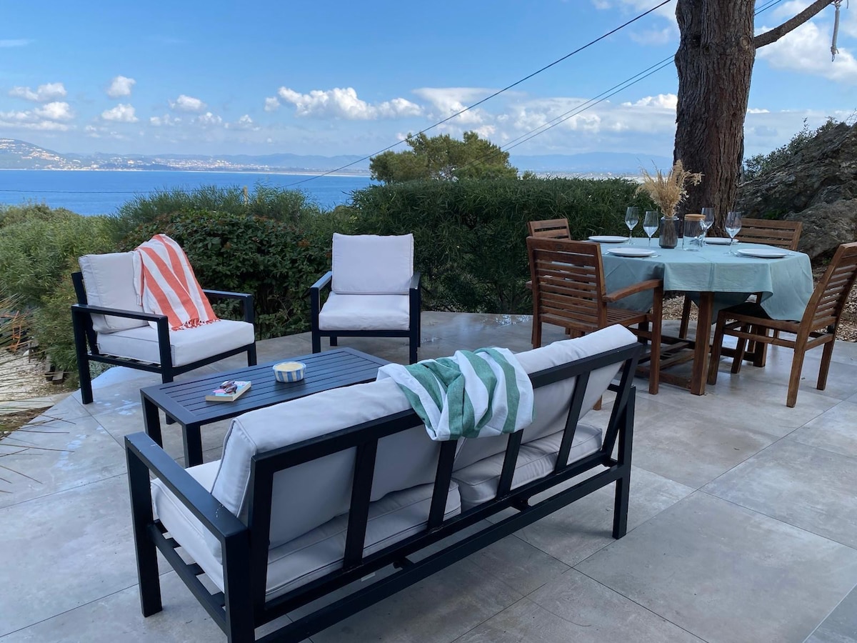 You will be our only guest! You can rent either our luxurious 33 m2 (353 sq2) studio, equipped for two or this studio plus an extra room, for four (60 m2- 642 sq2 total). The extra room can be added for 2 as an extra option. You would benefit from a 86 m2 (920 sq2) private terrace with a 180° panoramic breath-taking view on the Mediterranean and the Îles d’Or, as well as an amazing pool reserved only for our guests, overlooking the villa, with an equally incredible view!