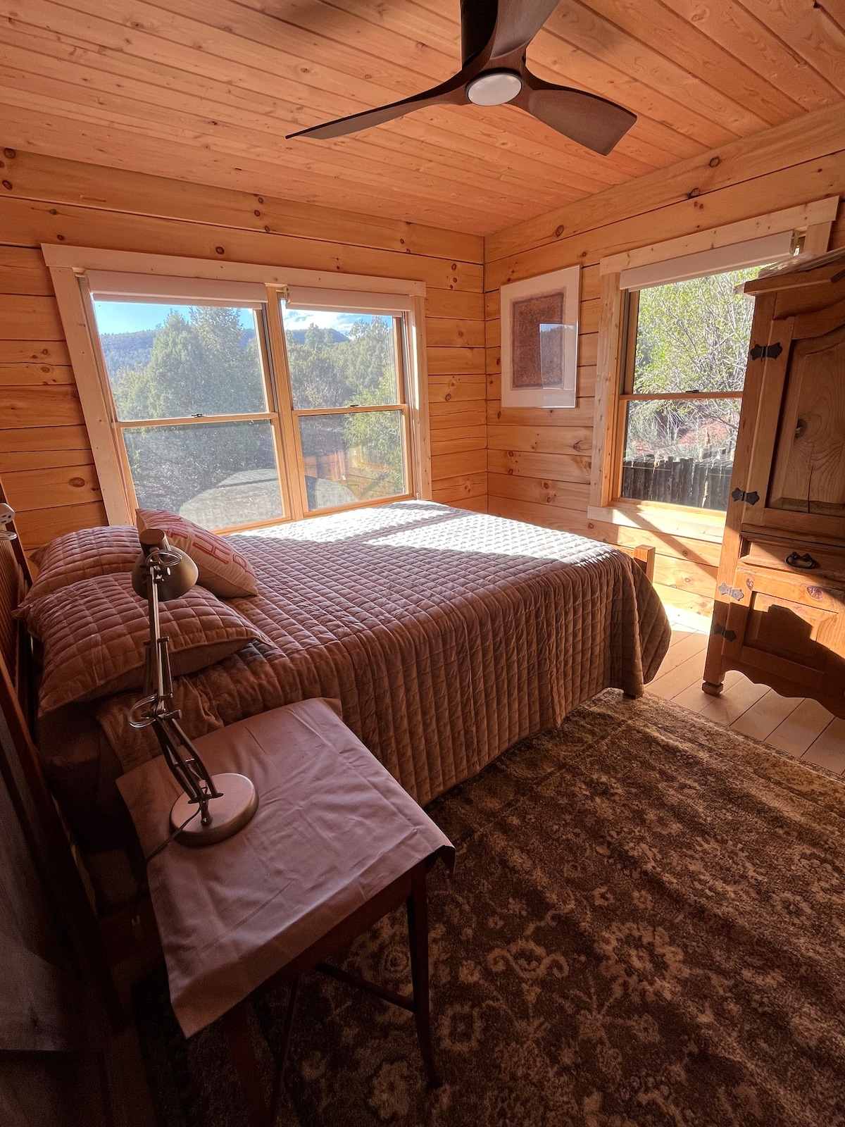 Chameleon: 2 room cabin, NO running water and no toilet facilities in the casita, sleeps 4, possibly 5, two (2) double beds in the bedroom, and a daybed for an extra person (for an added fee of $20.) Wood stove, hot plate & electric appliances for cooking. Open deck on the Pecos River! with an outdoor fireplace. Community bathhouse with commodes and showers, 300 feet from Chameleon. Some road noise can be heard, especially during peak travel times.