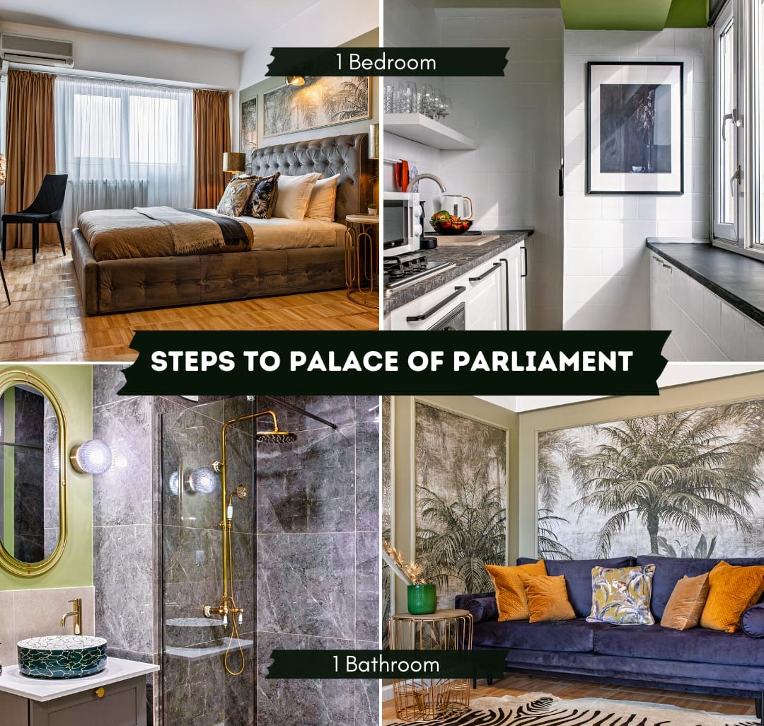 Stay in style at this stunning 1BR apartment just steps from the Palace of the Parliament. Designed with comfort and sophistication in mind, the home features custom furnishings, modern amenities, and professional management for a worry-free stay. The spacious layout includes a sleeper sofa for extra guests, multiple desk spaces for remote work, and blazing-fast Wi-Fi. Perfect for both business and leisure travelers, this flat offers a chic retreat in the heart of Bucharest.