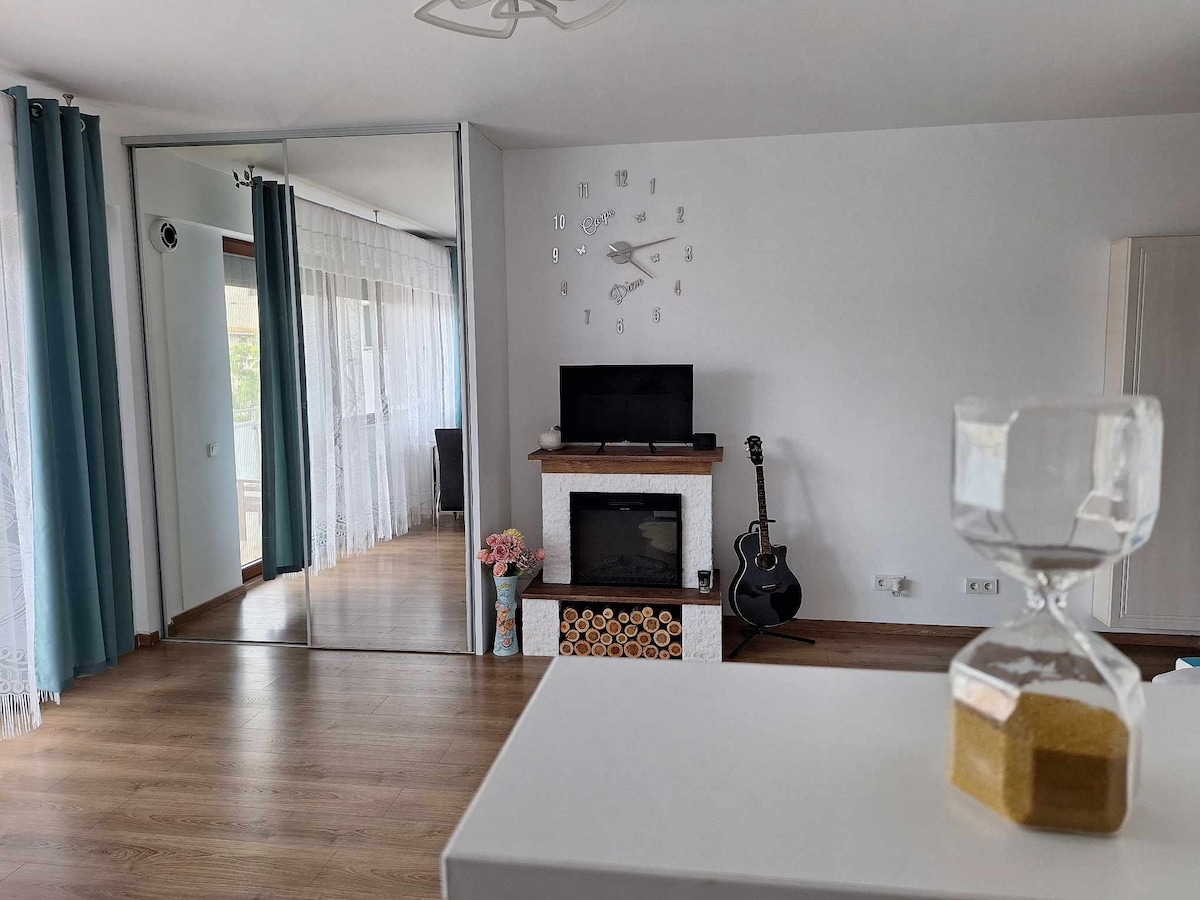 🌆 Skyline terrace + cozy fireplace in the heart of Bucharest. Modern studio in a new complex, ~10 min walk to Piața Unirii & Old Town—great for couples or remote workers. Highlights: • private terrace with skyline view • fireplace • dedicated workspace + fast Wi-Fi • fully equipped kitchen, dishwasher + washer • self check-in (lockbox) • calm area • free street parking nearby. Close to fountains, Palace of Parliament & Tineretului/Carol parks. Extras on request: monitor/flowers/cake