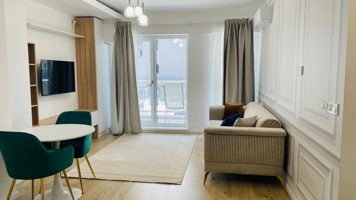 Relaxează-te în acest apartament elegant si modern situat intr-un complex residential nou care se afla intr-o zona de top a Bucuresti-ului. Dotări apartament: - Dormitor: Pat dublu, sifonier, birou cu scaun ergonomic, aer condiționat - Living: Coltar 3 locuri extensibil, TV smart full HD, aer condiționat, masuță cafea - Loc de servit masa