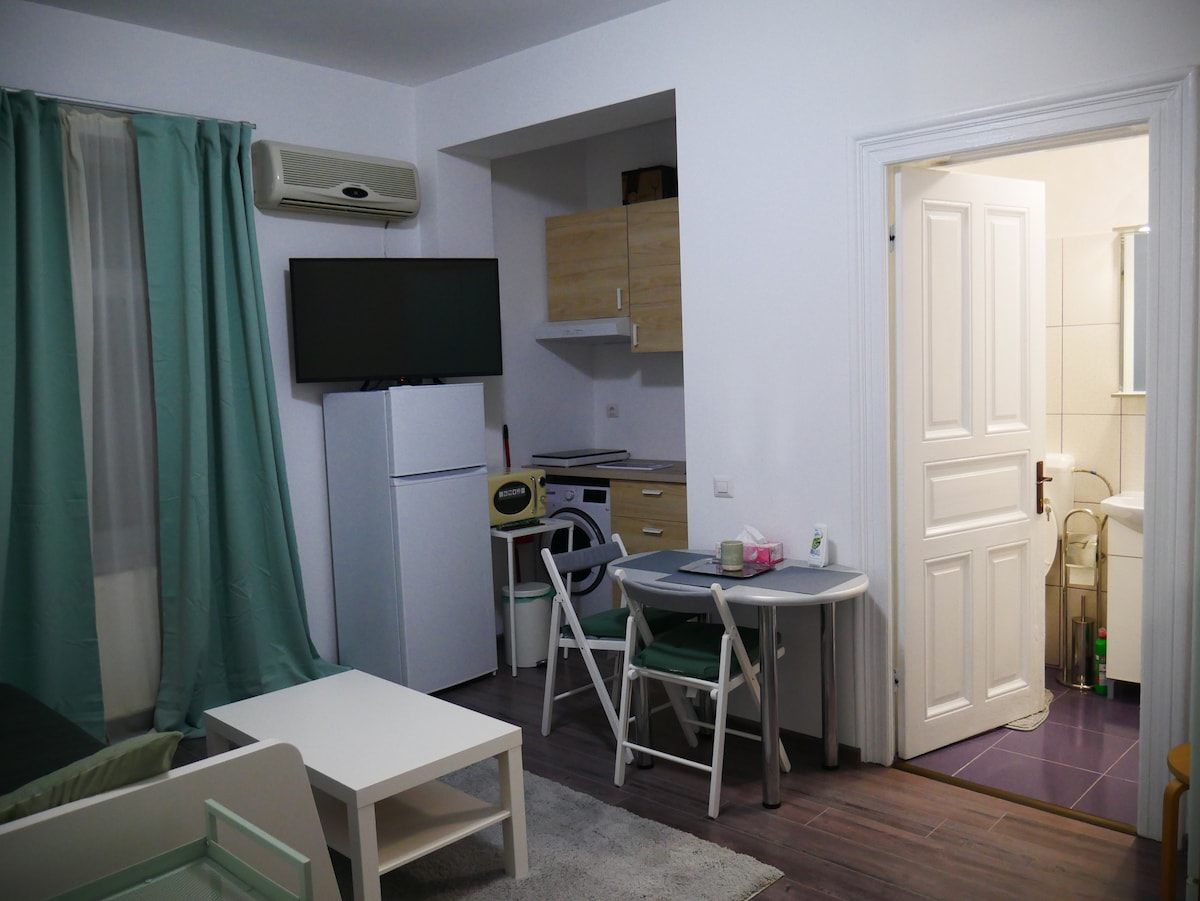 Studio modern si complet utilat, situat intr-o cladire monument din Cartierul Evreiesc, care încă păstrează urmele vieții de altă dată. Este poziționat in centrul capitalei, la 9 minute de mers pe jos la universitate, fiind ușor de ajuns oriunde în oraș. De asemenea, locația dispune in imediata apropiere de multe magazine alimentare, farmacii si spitale, iar accesul la căile de transport in comun se face chiar din fata casei. Este locul ideal pentru a-ți planifica un sejur in capitală!