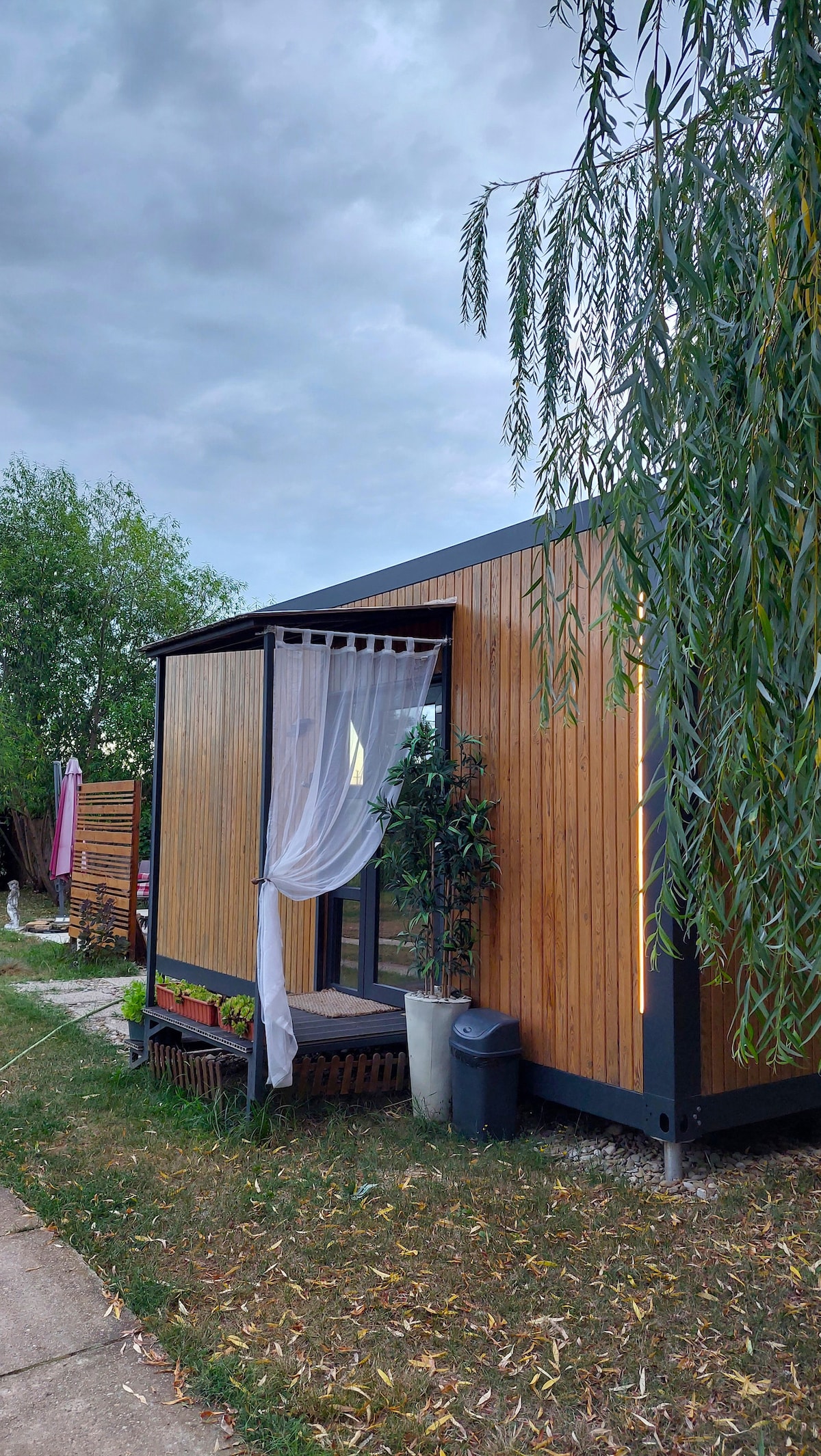 Casuta din gradina este construita de noi personal, pentru oaspeti. Este alcatuita dintr-un dormitor cu zona de bar/birou si o baie. De asemenea, avem ciubar traditional cu soba si cu apa sarata de mare pregatit de balaceala disponibil in perioada septembrie-mai cu preaviz 24hr si contra-cost 150RON. Casuta este izolata de casa mare, are intimitate si zona exterioara de relaxare proprie cand vremea permite. Este locatia ideala pentru innoptat dupa un eveniment in zona!