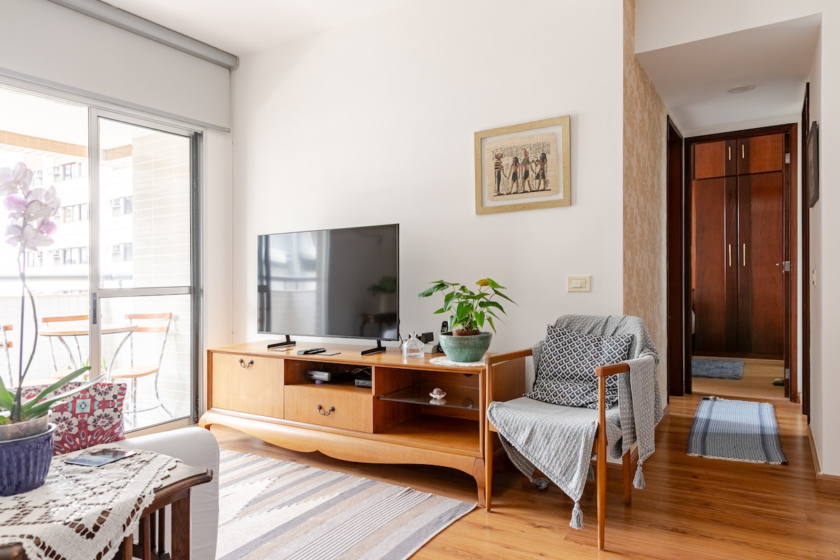 (Whole apartment!) Our quiet, comfortable space is ready for you! You'll have a kitchen with a washing machine and dishwasher, sunny living room with deck and spa, private bedroom with soundproof windows, a queen-sized bed, fiber broadband, WIFI, and suite bathroom with bathtub and shower. Botafogo is extremely walkable, and there's plenty of public transportation nearby. We are a 2 minute walk from the subway! Lay back, relax, and enjoy! We hope you enjoy your stay with us!