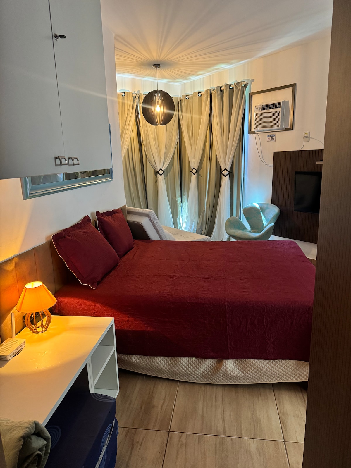 Flat aconchegante em Itacuruça, para desfrutar com sua família ou curtir a dois! O apartamento é sala-quarto, com uma cama de casal, um sofá cama, banheiro, copa com frigobar, microondas, cafeteira e varanda com vista p/ a montanha. O condomínio possui recepção 24 horas, elevador, piscina, academia e restaurante (refeições não estão incluídas no valor da hospedagem). Localizado no bairro Marina Porto, em Itacuruça: localização segura, próximo a restaurantes e ao Centro da cidade.