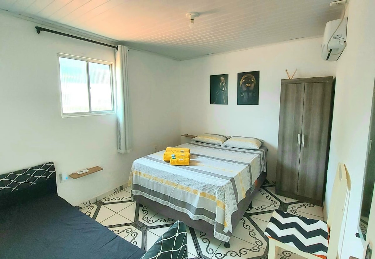 Bem-vindos! ALÉM DOS SONHOS IV é um conjugado cosy no 1ºandar com cozinha e 1 cama de casal, ar-condicionado, banheiro privativo. Localização excelente e silenciosa. 30mts da Praça Principal e 5min da 1a praia. Perto da Natureza Fornecemos enxoval completo de cama e banho e cuidamos da sua reserva do começo ao fim. *possível adicionar café da manhã à parte *temos parcerias com agencias locais para passeios e traslados *NOVO: Colocamos SMART TV :)
