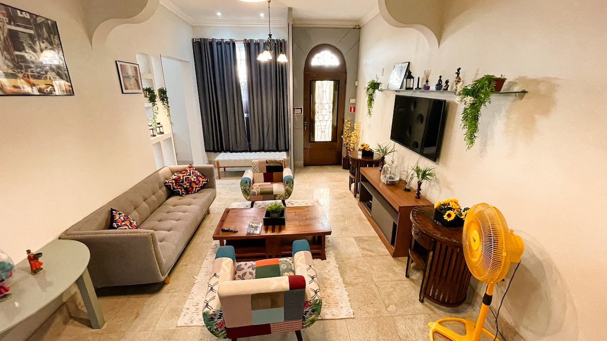 Apartamento excelente para casal com cama queen size e possibilidade de ate 4 pessoas com o sofá cama localizado na sala. Dois banheiros completos com chuveiro elétrico e ar condicionado em todos os ambientes. Garagem para um veículo. Cozinha com geladeira duplex, fogão a gás com forno e filtro duplo de água. Smart Tv de última geração 4K na sala e quarto.Internet de fibra ótica de alta velocidade, espaço para home office no andar superior(para maior conforto e produtividade). Lava e seca roupas