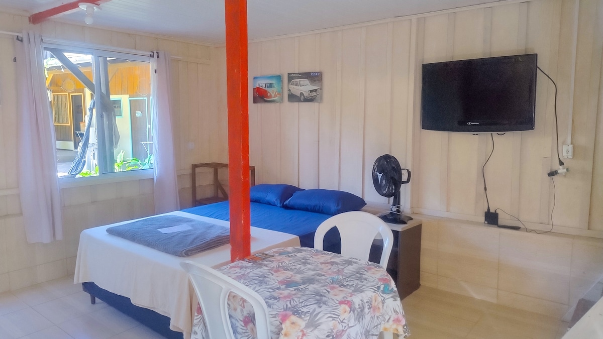 Kitinete p/02 pessoas, toda mobiliada. Internet - tv à cabo - ar condicionado - roupa de cama - cadeiras de praia - terreno todo cercado e arborizado - local seguro - à 70 mts da praia (perto do mercadinho, bares, restaurantes e padarias). Cozinha c/ pratos, talheres, copos, liquidificador, cafeteira, microondas sanduicheira. Fornecemos panos de pratos, papel toalha e material de limpeza. Não fornecemos toalhas de banho, somente roupas de cama.