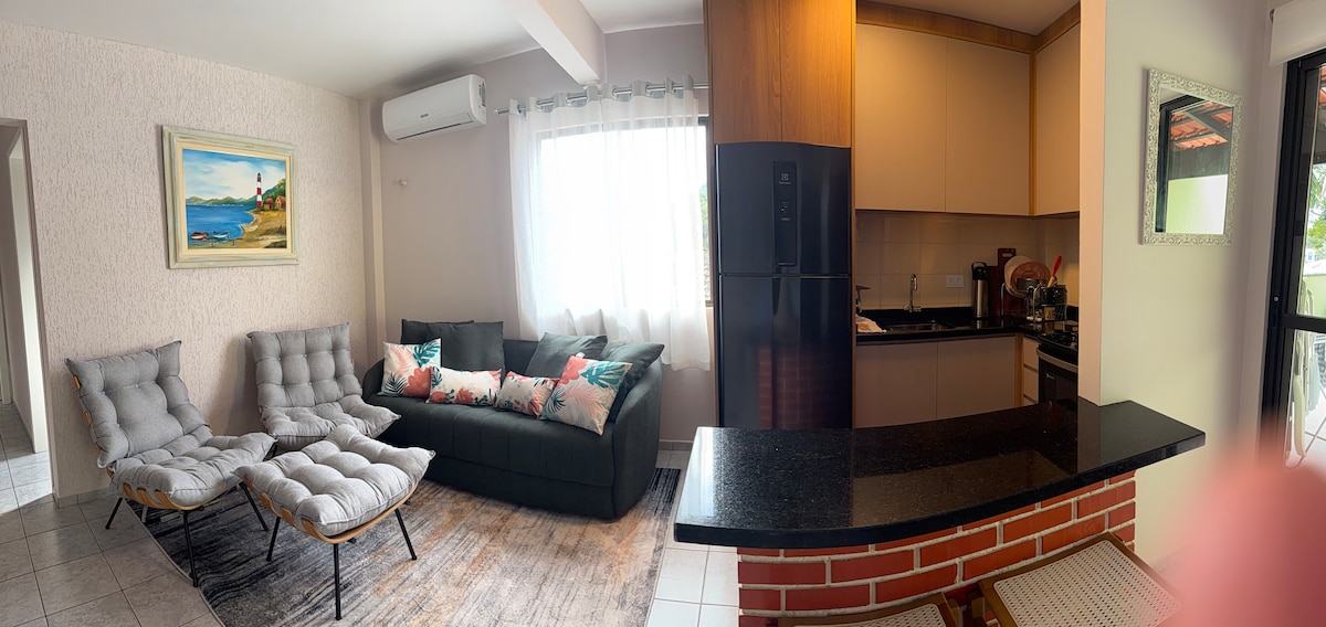Relaxe com toda a família nesta acomodação tranquila,local seguro para todas as pessoas e pets de pequeno e médio porte com todo conforto necessário para desfrutar de uma natureza deslumbrante. Nosso ap é novo todo mobiliado com móveis planejados, Smart TV, Wi-Fi, Ar condicionado,sacada com churrasqueira,tudo para proporcionar conforto e praticidade necessária para sua estadia. Oferecemos como empréstimo raquetes e bola, cadeiras de praia, e caixa térmica pequena para sua diversão em família.