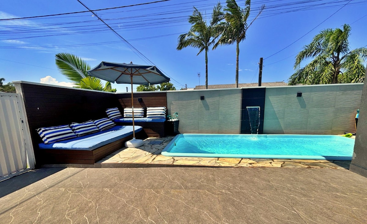 Relaxe com toda a sua família em uma casa nova charmosa e aconchegante. A estrutura é moderna e projetada, piscina com aquecimento solar, área de lazer espaçosa, churrasqueira equipada, quartos com ar-condicionados Daikin acionados via wi-fi, torneiras e chuveiros aquecidos a gás, alarme monitorado 24 horas e câmeras externas. Disponibilizamos carrinho de praia, cadeiras, guarda sol. Desfrute bons momentos. 7 min do embarque para a Ilha do mel.