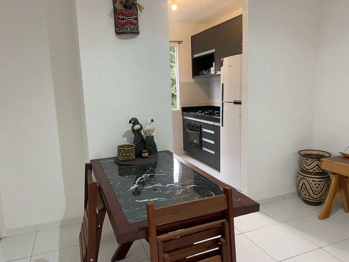 Um apartamento localizado há 200 metros da praia do farol. Relaxe em um lugar tranquilo e acolhedor! Ideal para quem busca conforto, descanso e praticidade. O ambiente é calmo, silencioso e perfeito para curtir momentos de lazer. O Apartamento contém 2 quartos grandes e super arejados. Tem estacionamento privativo, assim como churrasqueira na área de lazer. “Acordar aos cantos dos passarinhos, com aquele ventinho matinal gostoso e curtir aquele café na Vila, que coisa boa”.