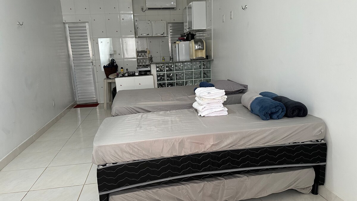 Desfrute de um Flat aconchegante no Condominio Murubira à beira da belíssima praia do Murubira! O flat oferece: ar condicionado, geladeira, fogão compacto de 1 boca, uma confortável cama de casal com cama auxiliar, e vaga de garagem para um veículo. Relaxe e aproveite as áreas comuns, incluindo uma piscina e um terraço com mesas para apreciar a vista da praia. Para sua conveniência, há também uma TV no hall de entrada, bem como Wi-Fi. Não disponibilizamos roupa de cama, caso precise informe.