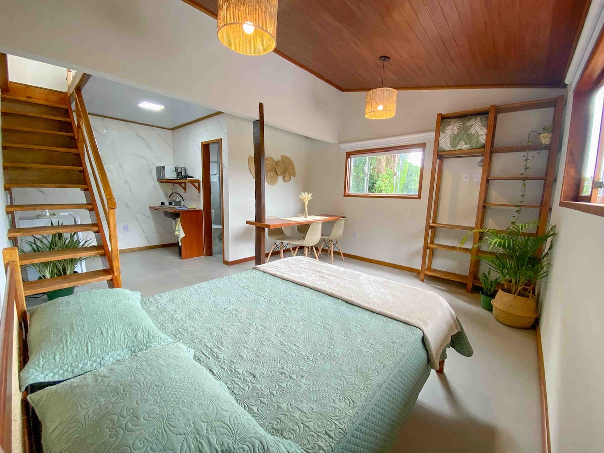 Excelente localização, sem morros. Estamos na rua principal, menos de 10 min do centro e a poucos metros da praia, onde estão os melhores restaurantes e bares. Quarto amplo e perfeito para famílias, possui uma cama de casal e 2 camas de solteiro no mezanino. Oferecemos 2 ar condicionados, wifi, frigobar, microondas, sanduicheira, cafeteira, utensílios básicos, pia, roupa de cama e banho, banheiro privativo, varal e área externa. Ambiente tranquilo, confortável. Garantimos fidelidade às fotos.