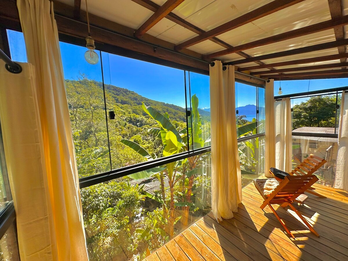 2-storey chalet and a viewpoint overlooking the sea surrounded by the Atlantic Forest. There are 2 bedrooms, office, upper deck with access to the gazebo, equipped kitchen, TV room with Netflix, bathroom, fully fenced backyard, shower, barbecue and garden with fruit trees. We have Wi-Fi throughout the property. We are just 10 minutes from the pier and 7 minutes from the shops of Vila do Abraão. Here it is not just accommodation but an experience of immersion in nature :-)
