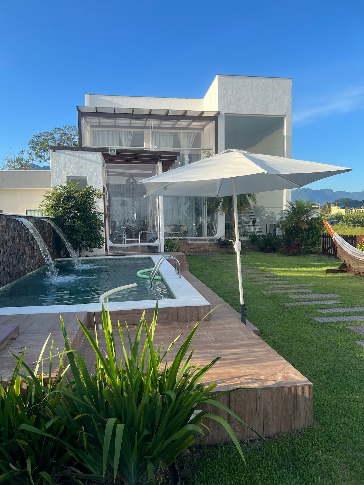 A beautiful house in Ilha Grande, an unspoiled gem with 107 beaches, a single town, Vila do Abraao and is mainly virgin Atlantic rainforest of which only 5% remains in the whole of Brazil. The house has 5 bedrooms, 4 bathrooms a spacious living room and common area. There are 2 bars close to the house that depending on the day can be noisy.