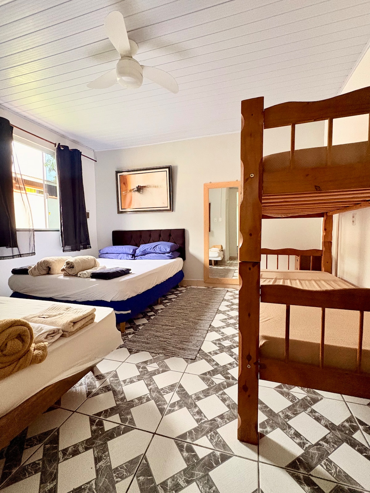 Suíte simples e aconchegante com uma localização excelente! Nossa suite fica a uma quadra da praia, próximo ao cais e do centro da Vila do Abraão, onde vc encontra lojas, bares, restaurantes e mercadinhos com facilidade. O quarto é divido em dois cômodos (são 2 camas de casal e 1 solteiro) e possui um banheiro privativo, ar condicionado, ventiladores de teto, tv e geladeira. Na área externa temos uma mesa e um chuveirão. ATENÇÃO: - temos pet (cachorros) em nosso quintal!! - NÃO temos cozinha!