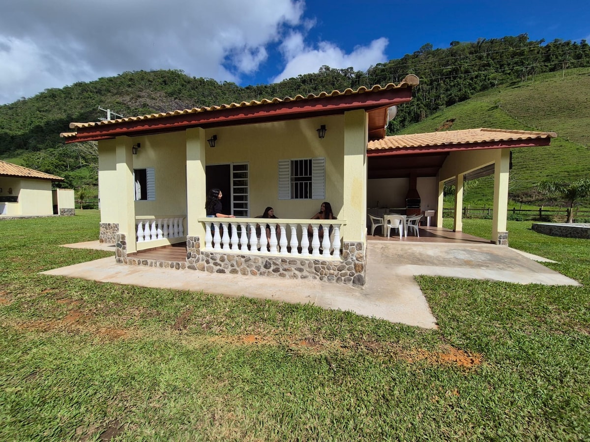 Casa com cachoeira, bela vista e quadra de vôlei.
