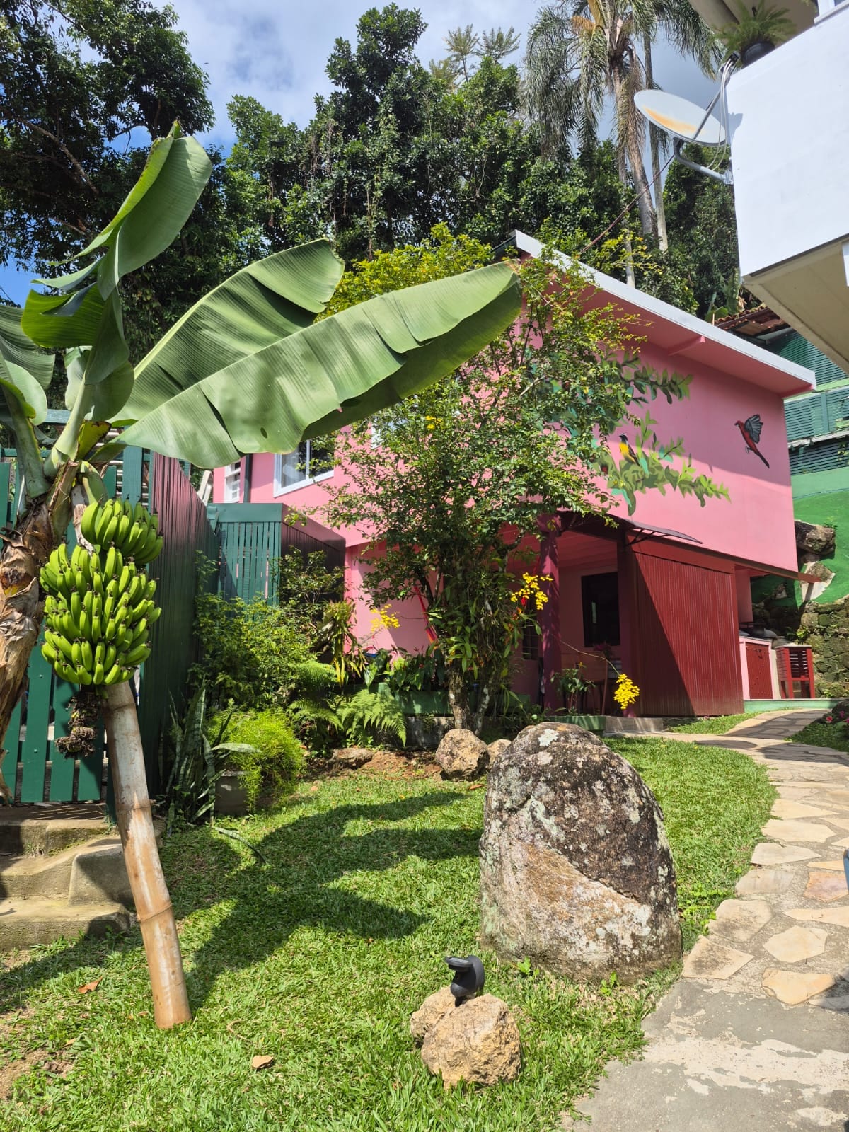 No meio da floresta, entre os pássaros, esquilos e macacos se encontra a Casa do Beija-Flor. Privacidade absoluta, a entrada e todos os espaços descritos são do uso privado para quem se hospeda aqui! tem um amplo deck externo com bancos, mesa e rede para descansar e contemplar as maravilhas da natureza. Imagine acordar com o som da cachoeira, respirando o ar fresco do lugar. Na chegada temos uma trilha curta com muito verde. Venha descansar no meio da natureza típica do Brasil.