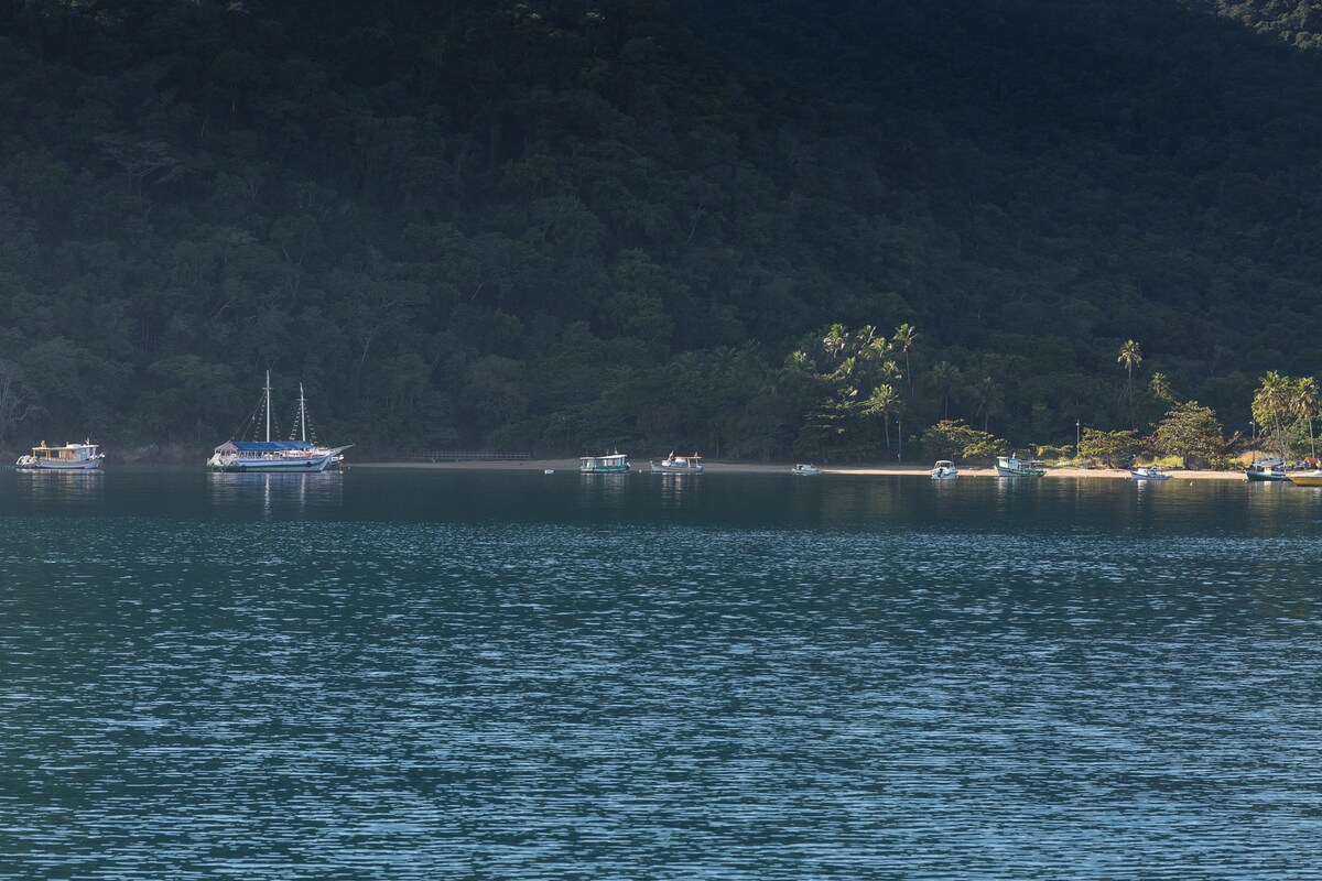Suíte com wi-fi, ar condicionado, pequena cozinha equipada na varanda e um vasto quintal. Ideal para casais, família e amigos! No canto da Praia da Longa a beira do mar, ao lado do maior estaleiro naval da Ilha Grande. Com direito a águas calmas, banho de mar, snorkel, canoagem, cachoeira, variedades de trilhas e etc... Passeios para outras praias disponíveis ao contactar flexboats próximos.
