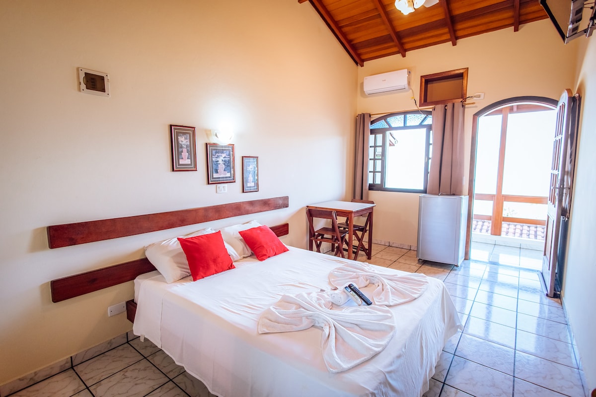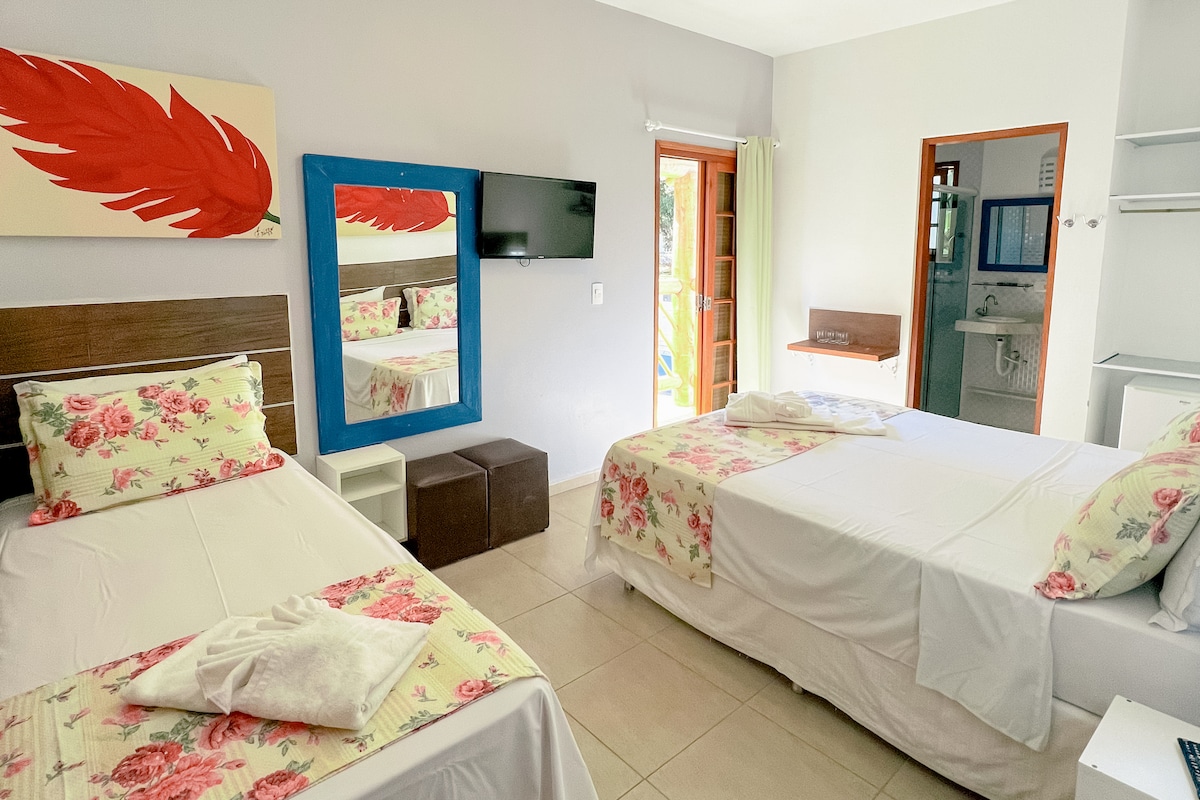 Equipado com uma cama Queen Size e uma cama de solteiro, ar-condicionado, TV LED de 32″, frigobar, guarda-roupas e banheiro privativo completo com amenidades de banho. Acomoda até 3 pessoas.