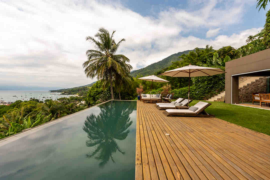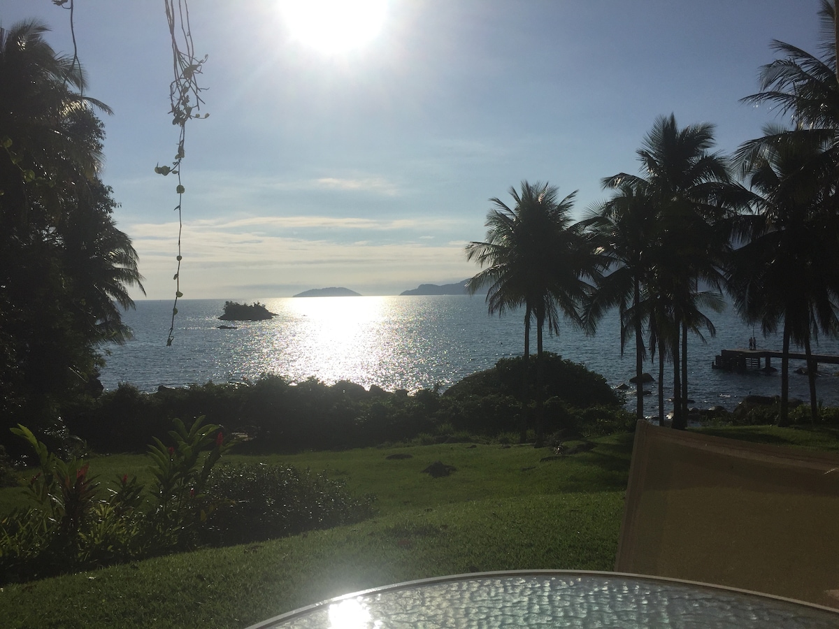 Casa com vista para o mar, piscina, churrasqueira e mesa de sinuca exclusivas dos hóspedes. Tem redes para descanso, ar condicionado em todos os quartos com lençóis e toalhas 100% algodão e Wi-Fi de 100 megabytes. Dispõe de cozinha completa para quem gosta de cozinhar. Próxima a várias praias e cachoeiras, conta ainda com supermercado e farmácia a uma distância caminhável. E fica em Ilhabela, parque nacional de natureza exuberante com vários restaurantes, eventos e shows durante o ano.