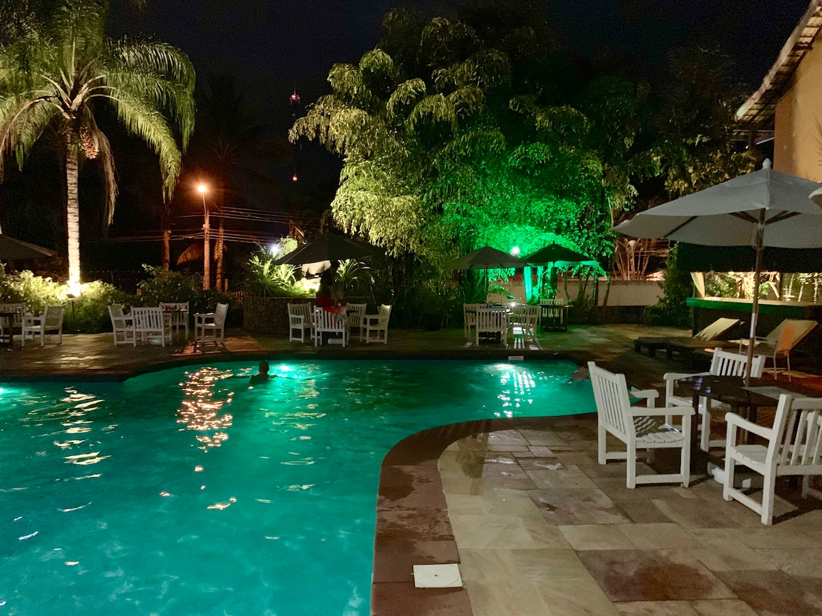 Bungalow near the beach in a gated community with 24-hour security. Kitchen with minibar, stove and basic items. Cozy suite with TV, king-size bed, jacuzzi and balcony. Living room with sofa bed and balcony, next to the conservation area. Condominium with swimming pool, gym, playground, tennis and multi-sports court, sauna, games room, TV room. Shuttle service to the reception, in front of the beach. Deck on Curral beach with tables, chairs, freshwater shower exclusive for Yacamim guests.