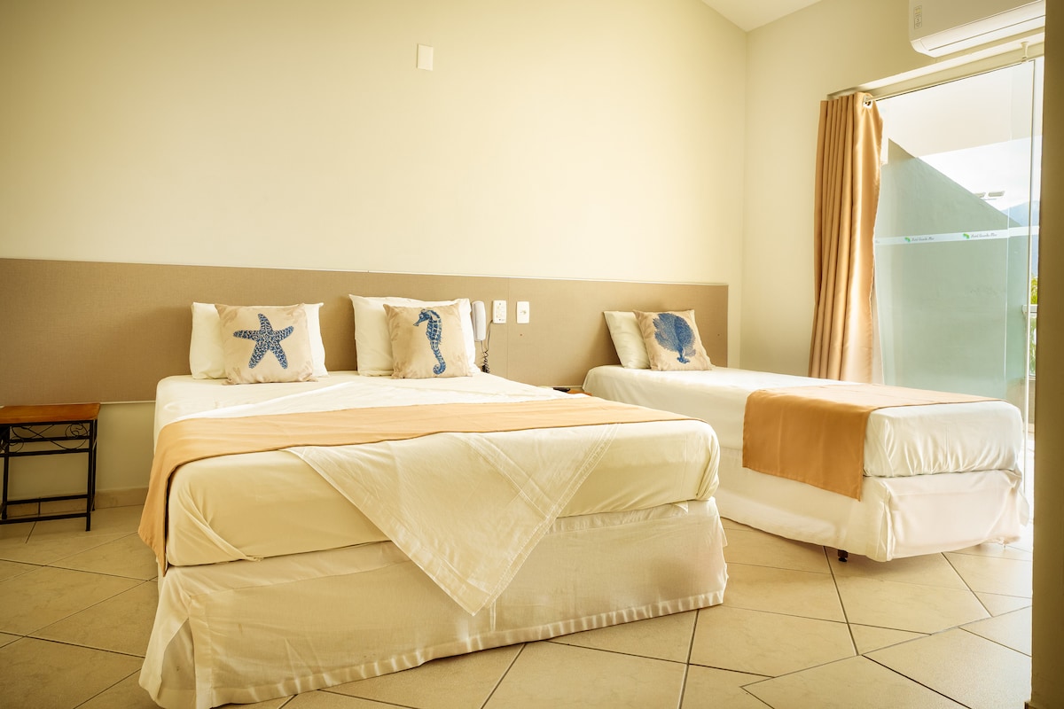 The Coziest, with breakfast included in all daily rates. The Junior Room is located on the ground floor, featuring 18m² (approximately 194 sq ft) and offers an accessible option. Equipped with 1 double bed + 1 single bed, Split Air-Conditioning, Smart TV, private balcony, Wi-Fi, minibar, fan, safe, clothes drying rack, bed and bath linens, pillows, and a private bathroom with complimentary toiletries and a hairdryer. Accommodates up to 3 people.