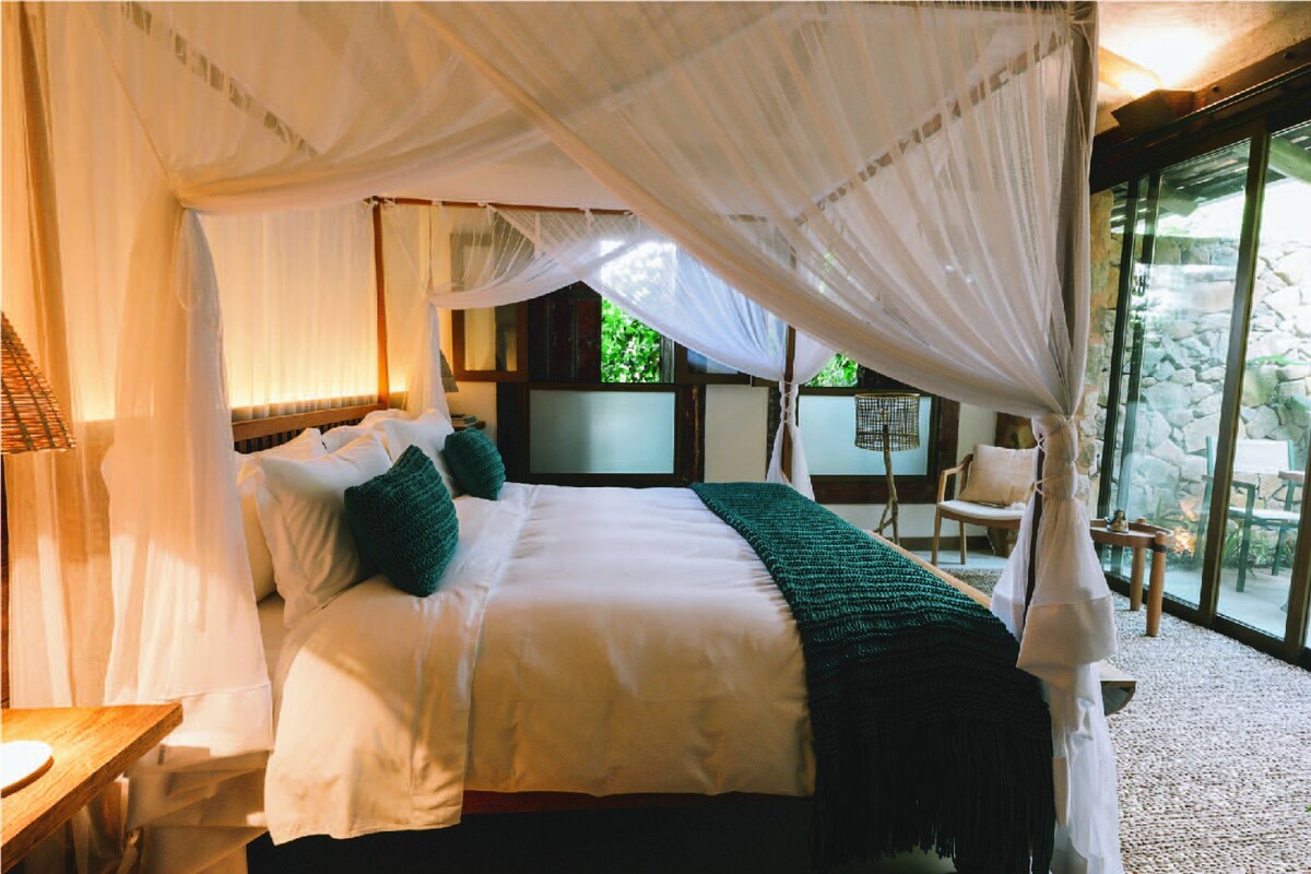 Rodeados de jardim e com muita luz natural nossos quartos são o equilíbrio perfeito de luxo e natureza. Todos os detalhes foram pensados para que o hóspede se sinta em casa. Com arquitetura rústica e sustentável, buscamos resgatar técnicas caiçaras de construção e implementamos um paisagismo de mata atlântica priorizando plantas nativas em extinção. Os quartos possuem cama king size, abraçadas por um dossel, banheira em meio a natureza, televisão, frigobar e mesa para trabalho à distância.