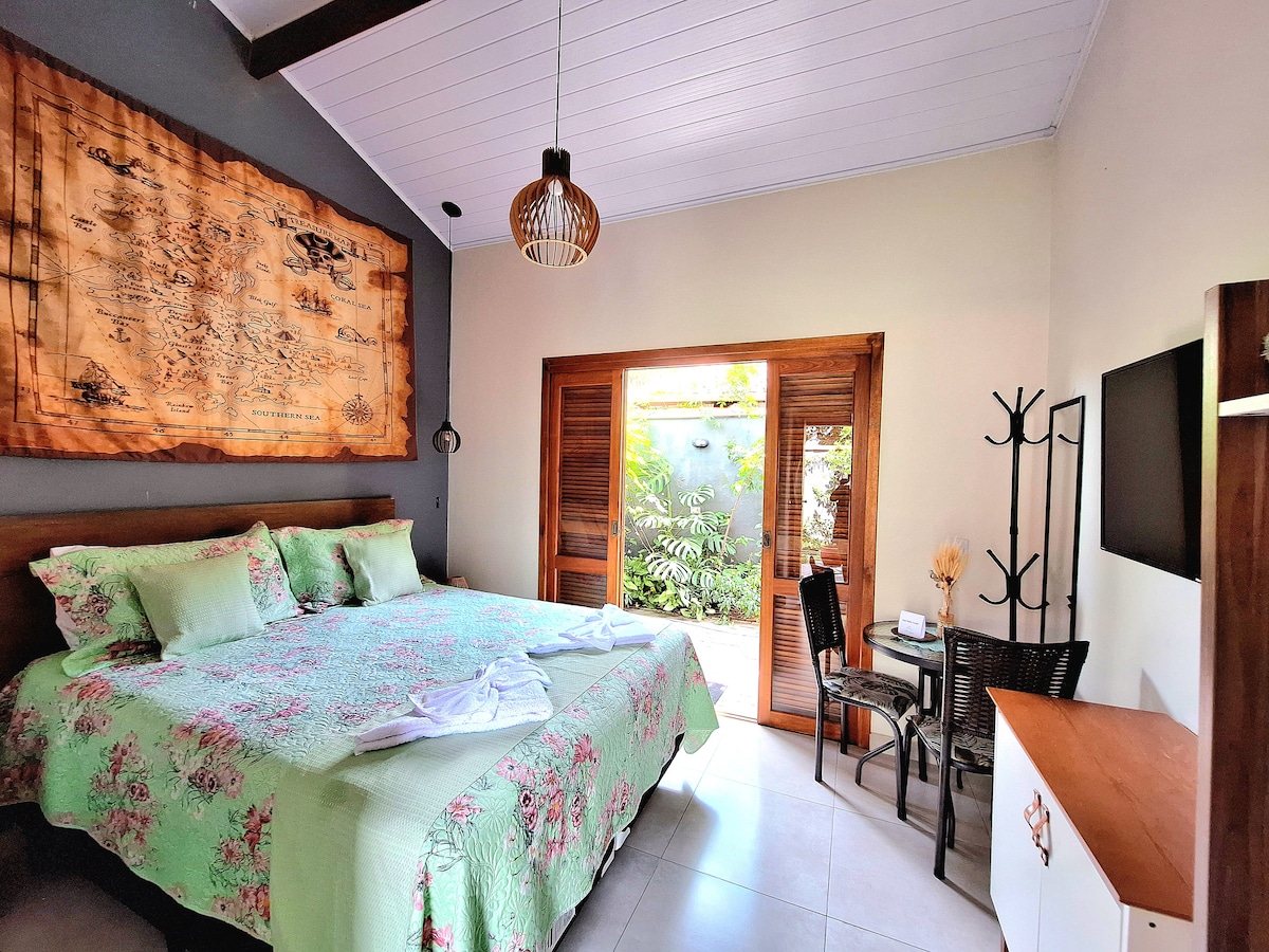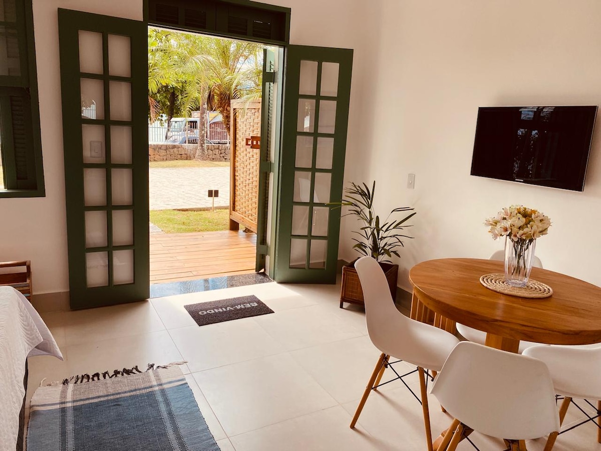 Charming loft,standing in the sand on one of the most beautiful and trendy beaches of Ilhabela. Carefully equipped to offer a comfortable and unforgettable stay,it has air conditioning,ceiling fan,electric shower with stall,refrigerator,sink, microwave, electric oven, coffee machine, and other accessories. Double sofa-bed, single bed, and two extra inflatable double mattresses. Outside we have a deck on the sand in front of the sea, a shower, a hammock swing under a treetop, tables, and benches.