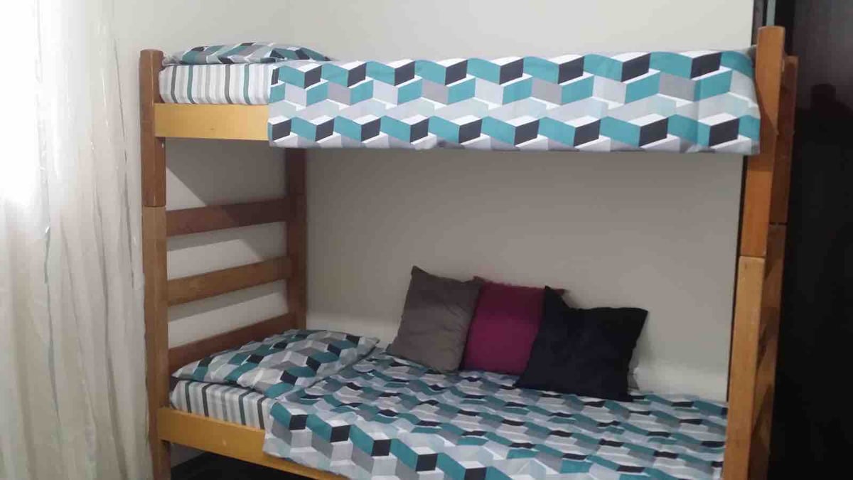 Suíte pequena e aconchegante (quarto com banheiro individual) com ar condicionado, cama de casal tamanho Queen, super confortável com muita privacidade. A suíte ainda tem uma cama de solteiro, se precisar de um espaço a mais para familiares .Lençóis de Percal 100% algodão, de pelo menos 200 fios, toalhas de banho. A suite está equipada com um frigobar. A rua é tranquila e permite estacionar com segurança.A casa possui apenas duas vagas de carro no estacionamento,o uso é por ordem de chegada.
