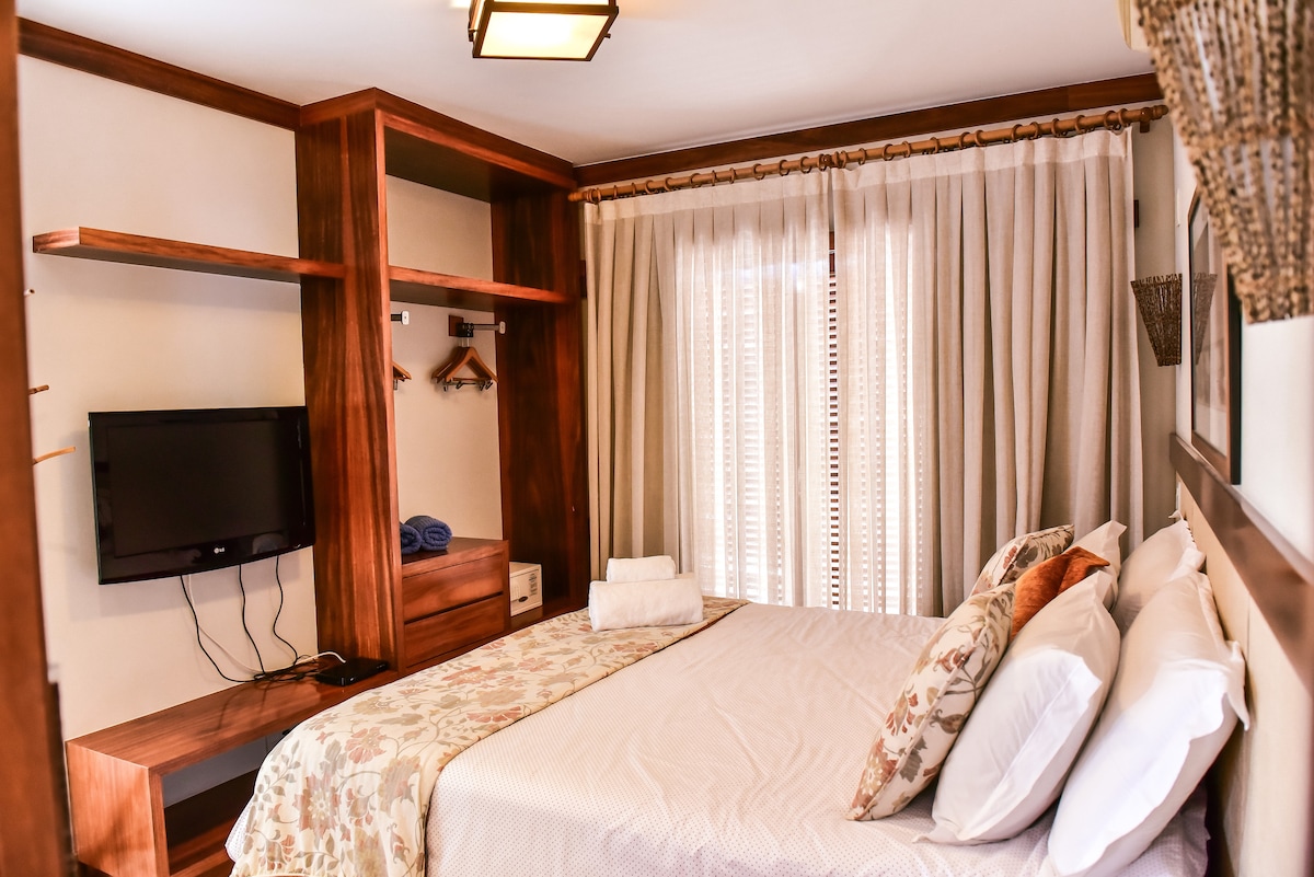 O flat dispõe de 1 cama de casal e 1 sofá-cama, acomodando muito bem até 4 pessoas. IMPORTANTE: a 1ª troca da roupa de cama de casal é CORTESIA do anfitriação, as demais trocas terão um custo adicional conforme tabela abaixo: Casal > R$33,00 Triplo > R$51,00 Quadruplo > R$70,00 Toalhas > R$4,00 (cada) Obs: os cobertores NAO incluso As solicitações adicionais destes itens deverão ser feitos na recepção e o pagamento no check out. cafe da manhã NÃO incluso na diária. Pets NÃO permitidos.