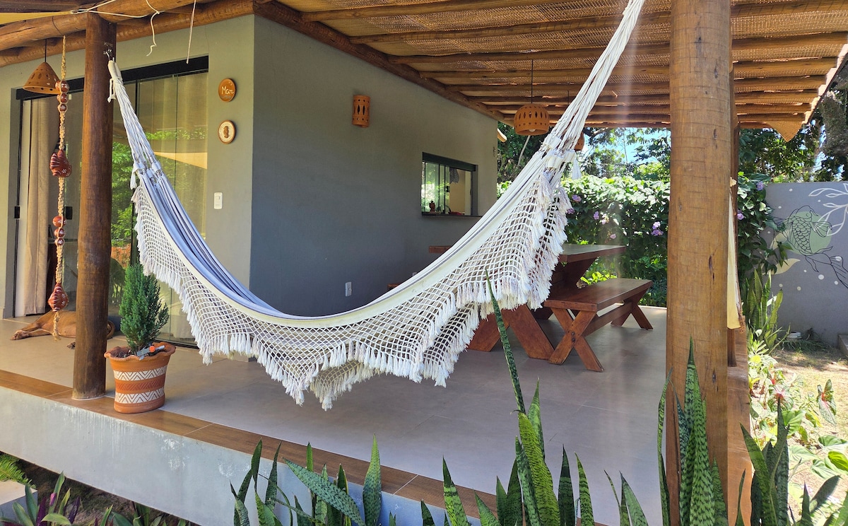A nossa casa está a 70,00 m da praia, a varanda se estende por toda a frente da casa e termina em uma deliciosa área gourmet, churrasqueira e chuveirão. Um quintal de 1.200m2 totalmente cercado, com parquinho pra criançada ficar solta à vontade com toda a segurança, árvores frutíferas, coqueiros, e um imenso mar azul pra compor a paisagem deslumbrante. AR CONDICIONADO em todos os quartos ! INTERNET FIBRA ÓPTICA 100MG e estação de trabalho "beach office" com vista para o mar !