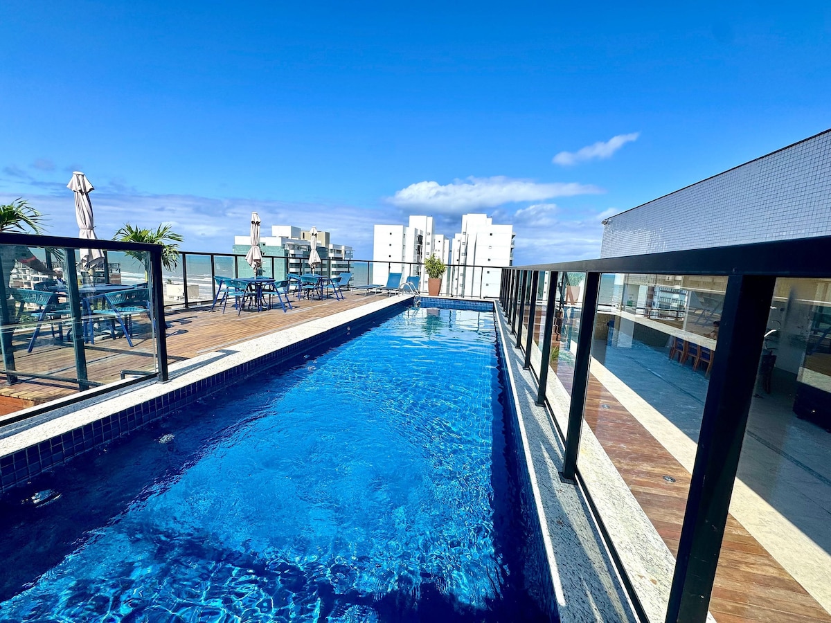 Localizado em frente à Praia, próximo à SmartFit, ao Atacarejo, além de cafés e restaurantes. Possui uma suíte com cama de casal “queen size”, outro quarto com duas camas de solteiro, ambos com ar condicionado split, TV por assinatura, “Wi-Fi”, cozinha, área de serviço e varanda, com vista para o mar de todos os quartos. Possui segurança eletrônica, elevador panorâmico, duas garagens para carros de médio porte, espaço kids, salão de jogos, espaço gourmet, academia, sauna e piscina.