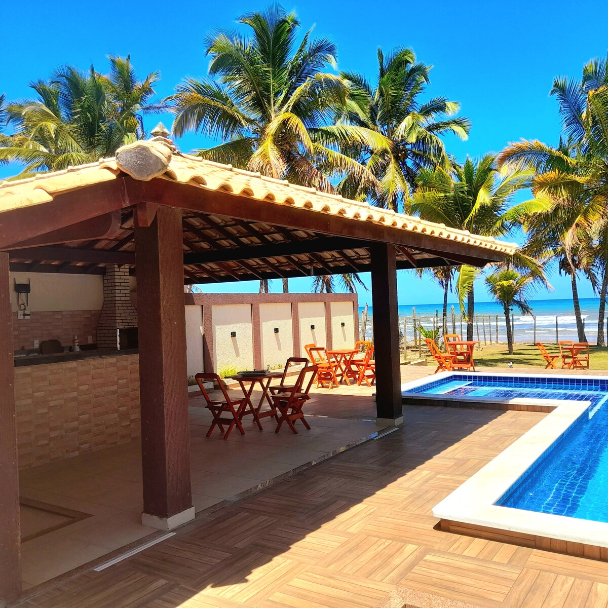A nossa casa está a 70,00 m da praia, a varanda se estende por toda a frente da casa e termina em uma deliciosa área gourmet, churrasqueira e chuveirão. Um quintal de 1.200m2 totalmente cercado, com parquinho pra criançada ficar solta à vontade com toda a segurança, árvores frutíferas, coqueiros, e um imenso mar azul pra compor a paisagem deslumbrante. AR CONDICIONADO em todos os quartos ! INTERNET FIBRA ÓPTICA 100MG e estação de trabalho "beach office" com vista para o mar !