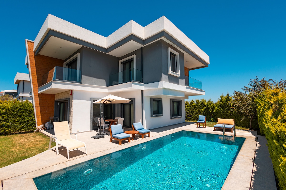 This 4 bedroom, 4 bathroom, office home is a newly built modern oasis in the Ilica neighborhood, designed for your comfort and luxury in mind. Whether you want to enjoy the summer sun by the pool, have a getaway from the city on a crisp fall week or cozy up by the fireplace for the holidays, this place is for you. It's a 6 minute drive away from Alacati with its narrow cobblestone streets filled with local bars and boutiques, and just an 8 minute walk away from beautiful sandy beaches of Ilica.