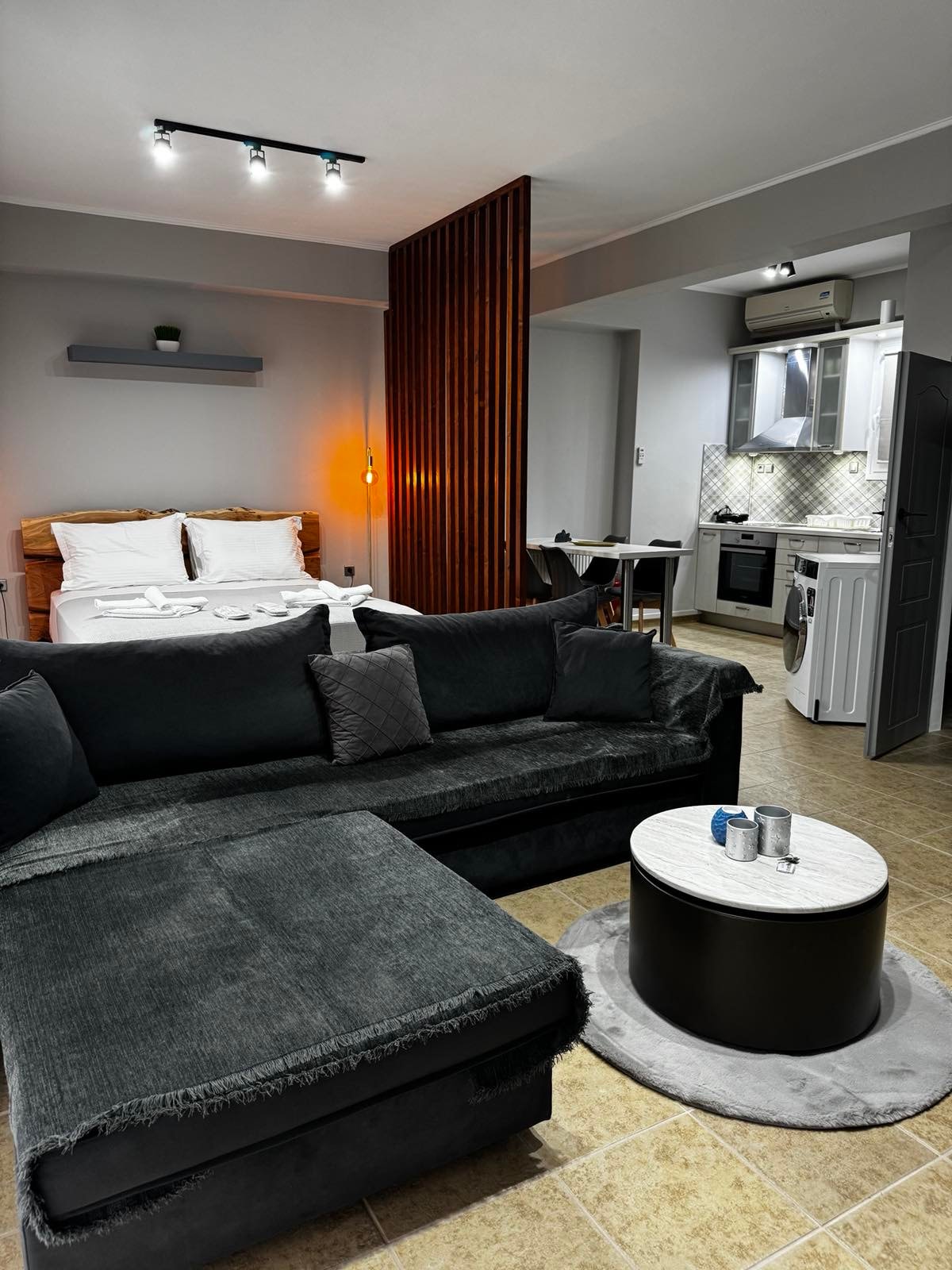 Μοντέρνο, ολοκαίνουργιο στούντιο 45 τ.μ. με κομψή διακόσμηση, άνετο γωνιακό καναπέ και ζεστό υπνοδωμάτιο χωρισμένο με ξύλινο πάνελ. Πλήρως εξοπλισμένη κουζίνα με ολοκαίνουργιες συσκευές, πλυντήριο–στεγνωτήριο, κλιματισμός και σύγχρονη τηλεόραση. Ένας άνετος, προσεγμένος χώρος ιδανικός για χαλάρωση ή επαγγελματική διαμονή.