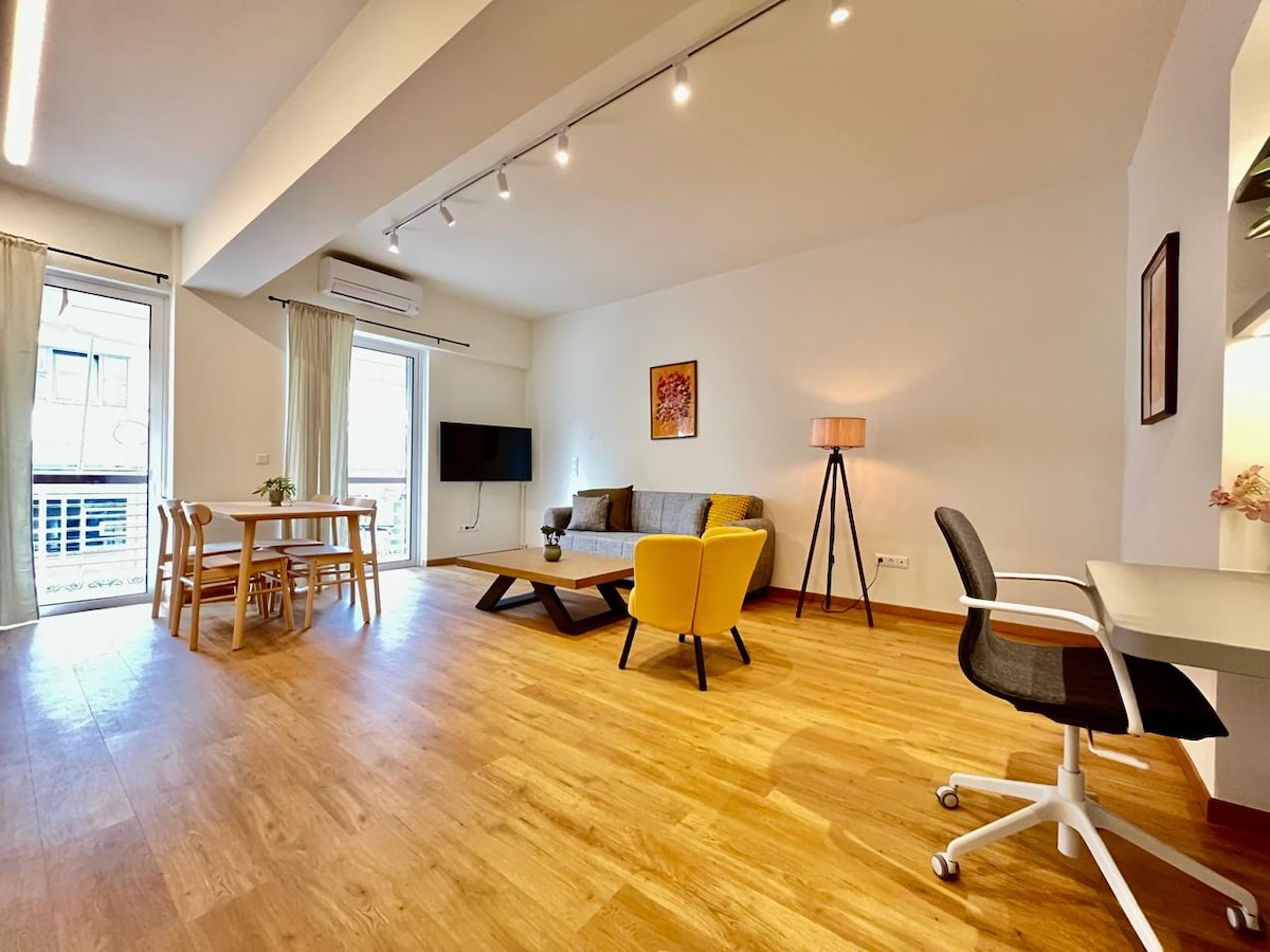 Kick back and relax in this calm, stylish space. Perfect for couples or couples with a child (baby crib/playpen and bath available). Sofa opens into an extra bed. The Queen Murphy bed can be left open or closed on the wall, to make a large living room. Located on the cusp with Glyfada, it's a 7-min walk to the famous Fashion District and only a 4-min walk to the Tram which runs to Piraeus, Acropolis, Syntagma, Airport. Walk to many beaches, restaurants, supermarkets, movies. Welcome & Enjoy!