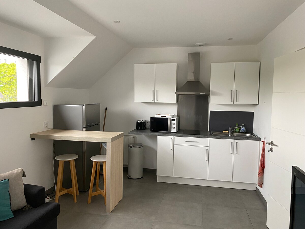 Appartement indépendant chez l’habitant de 40m2 situé à Bruz. Vous disposez d’un lumineux salon sans balcon, d’une chambre avec lit de 140x190 , d’une cuisine équipée , d’une salle de bain avec douche à l’italienne et d’un WC. Bus à 50 mètres. La gare de Bruz se situe à 800m du logement et l‘aéroport et le campus Kerlann à 10 Minutes en voiture .