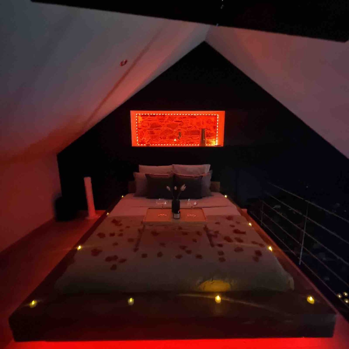 Proche de Rennes Suite de luxe Loverrom avec jacuzzi pour escapade romantique. Maison d’environ 100m², conçue pour un séjour inoubliable en couple. - Jacuzzi privatif. - Literie haut de gamme, digne d’un hôtel 5 étoiles - Salle de bain avec double douche à l’italienne. - Table de massage. - Cuisine entièrement équipée. - Cafetière Delonghi à grains - Grand écran TV / ensemble sonos dans chaque pièce. - Wi-Fi fibre haut débit - Linge de maison et serviettes - Parking privé