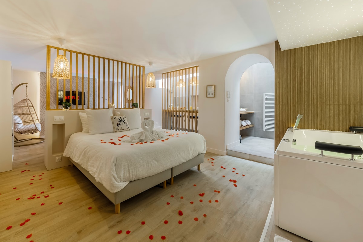 Logement Haut de Gamme avec Balnéo, Sauna, sofa tantra, porte secrète révèle un spa privatif avec sauna & table de massage. Offrez-vous une parenthèse de détente dans ce magnifique logement inspiré de Bali de 66 m² pour deux personnes. Tout confort : • Suite avec lit King Size (180x200), literie haut de gamme • Balnéo double avec ciel étoilé • Pièce secrète avec table de massage & Sauna • Salon avec cheminée à vapeur et télé connectée • Salle de bain avec une double douche • Fauteuil tantra