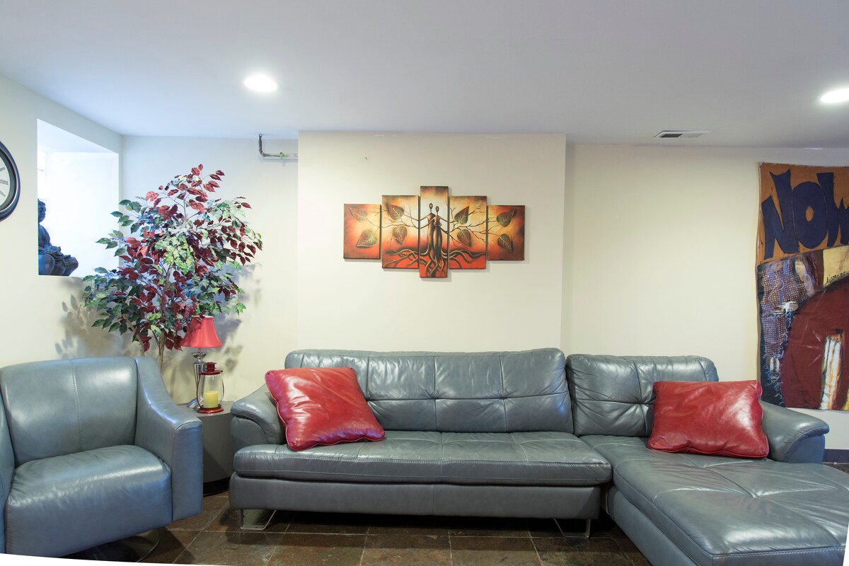 Enjoy this fun and unique 1-bed 1.5-bath speakeasy in the heart of Chicago's Bronzeville District. This artsy vibe features eclectic décor, hand-painted murals, Smart TVs, wet bar, wellness studio, remote workspace, free street parking, and ground-level-step-free access. This cozy space is perfect for fun couples, solo adventurers, business travelers, and game night aficionados. Easy access to Downtown (6 miles to Mag Mile, Navy Pier, Millennium Park), Beach (1 mile), Museums, & Sports arenas.