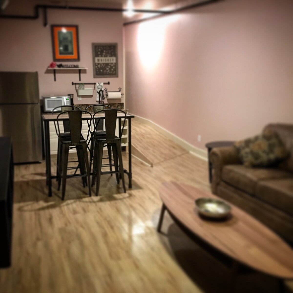 Newly renovated building in historic, Uptown Galena above Miss Kitty's Grape Escape. Enjoy amazing views of downtown without having to take a single stair. Fully accessible apartment features lowest threshold shower, kitchenette with microwave and coffee/kcup maker, large rooms, 55" smart TV with wifi, bathrobes and lush towels. Living room includes very comfy sofa (but does not pull out). Easy access to premier night life and entertainment just below at Miss Kitty's Grape Escape.